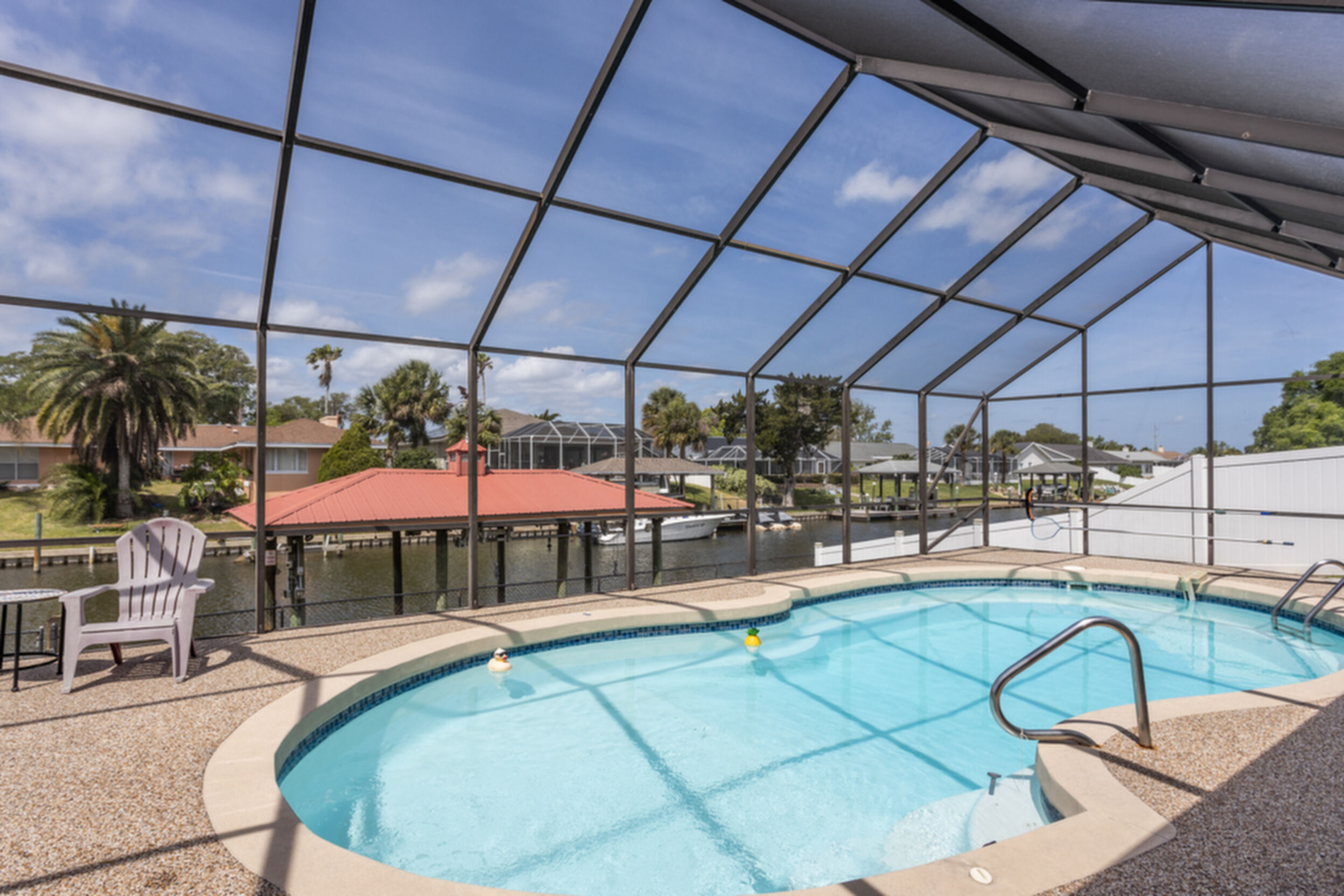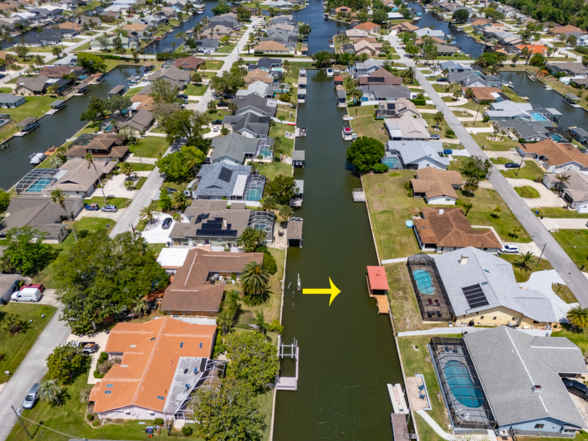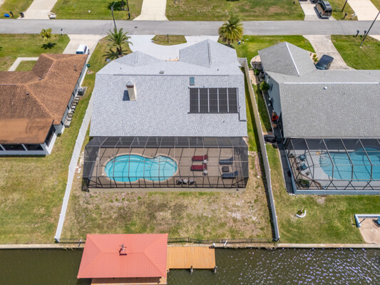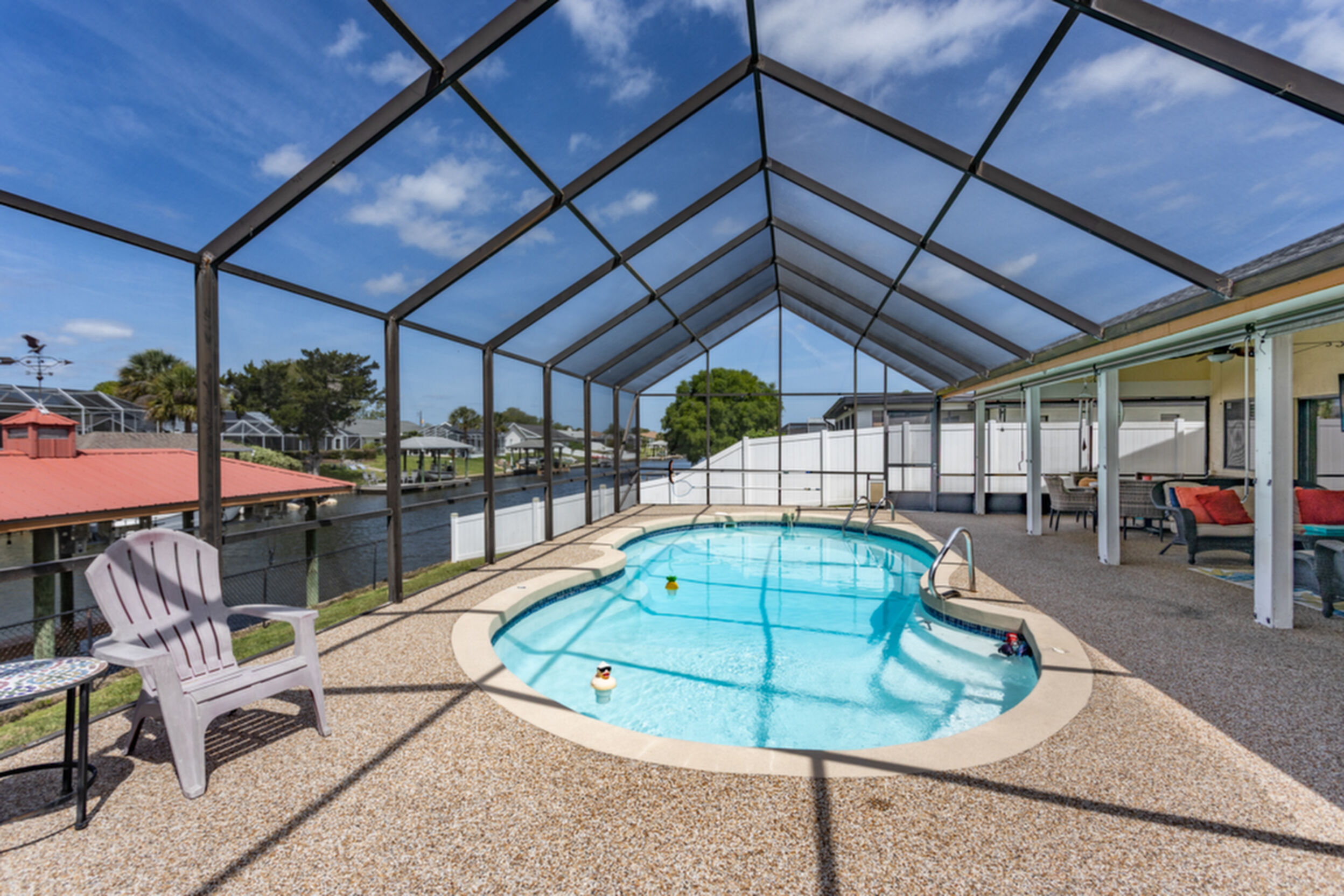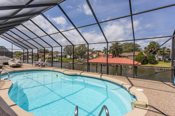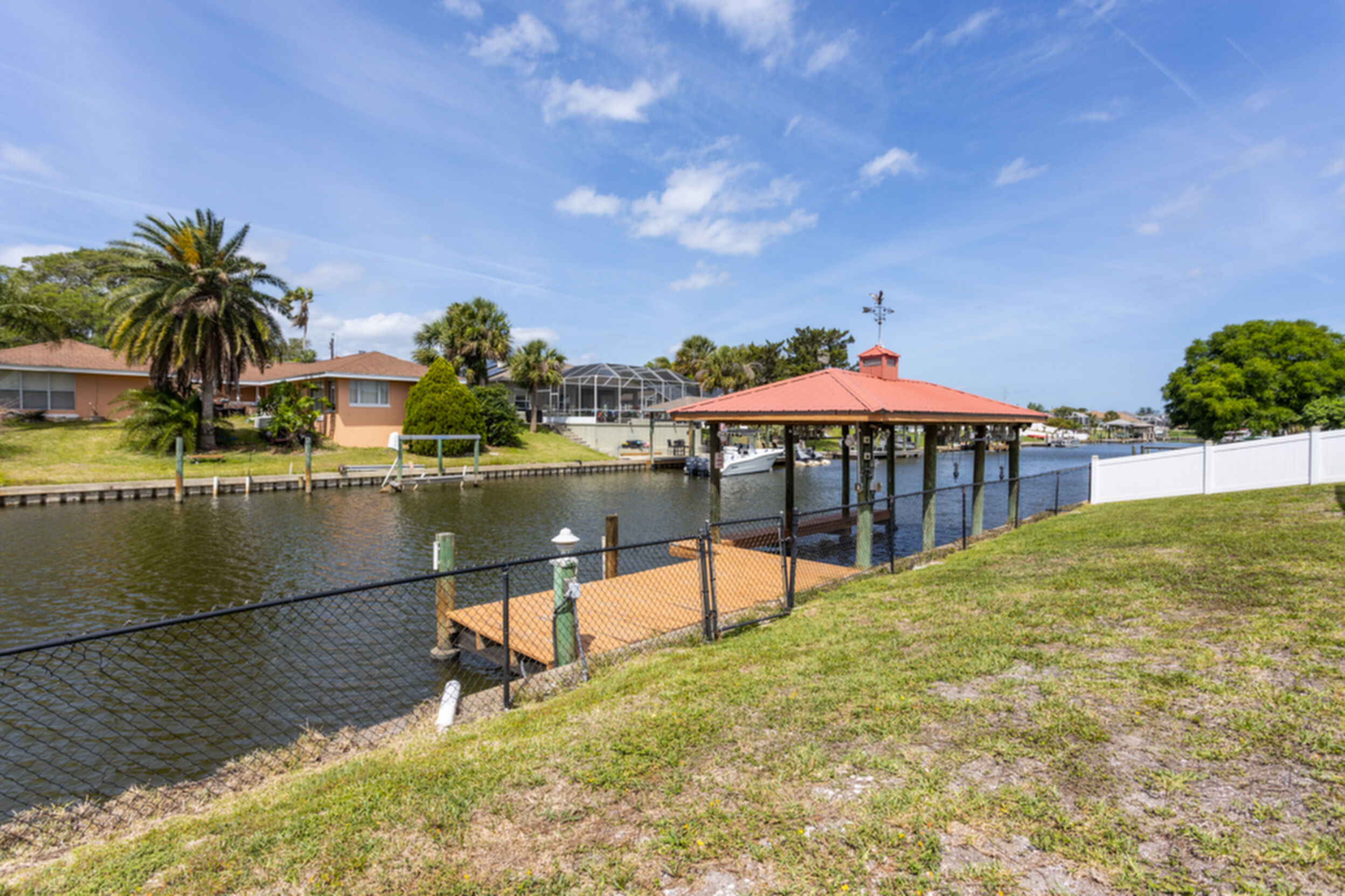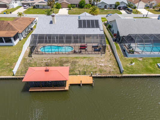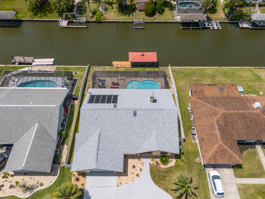 Wake up to dolphins swimming past your private dock. This stunning saltwater canal pool home delivers the ultimate Florida lifestyle. Solar-heated saltwater pool with Chattahoochee deck, covered 10,000 lb. boat lift, and direct Intracoastal access just minutes away. Huge lanai with outdoor kitchen and built-in grill. This home has been renovated to modern perfection - soaring vaulted ceilings greet you at the stunning double glass entry doors. The gorgeous updated kitchen is a showstopper. Zero carpet - hardwood and luxury tile throughout. The master suite is a private retreat featuring an oversized, spa-like walk-in shower. Three bedrooms plus a den/flex room gives you space to live, work, and host. Major updates already done for you: new roof 2022, brand new A/C 2024 with new ductwork, and a whole-house generator. No HOA means complete freedom to continue as a proven vacation rental or make it your forever home. Furniture negotiable. Move in and start the Florida dream immediately.