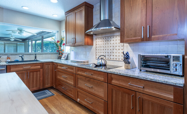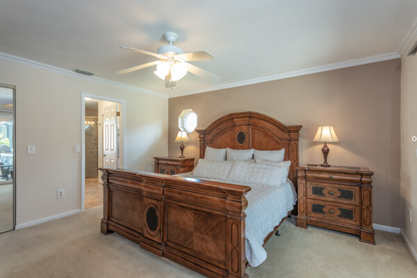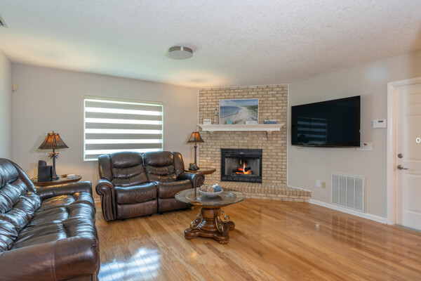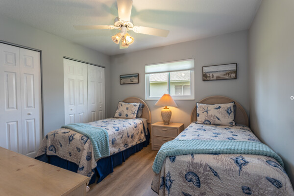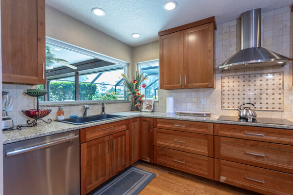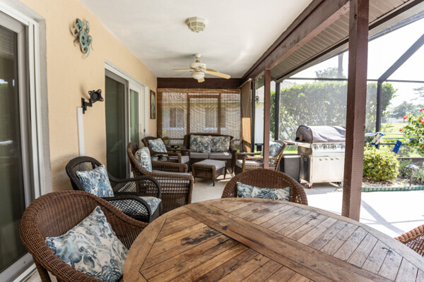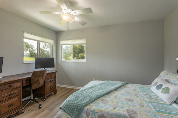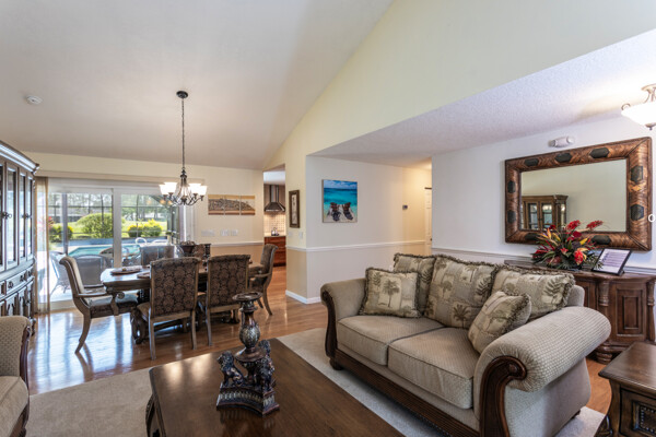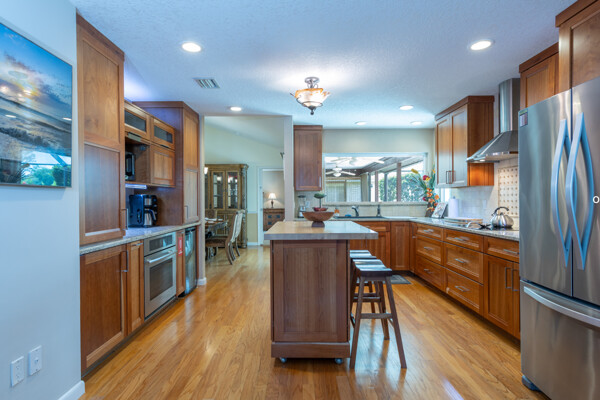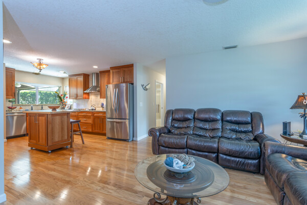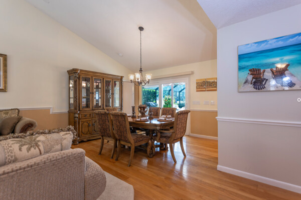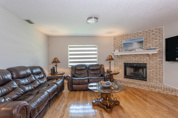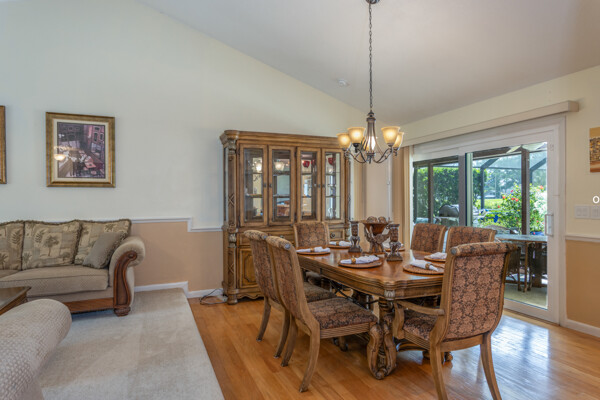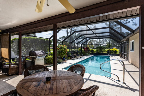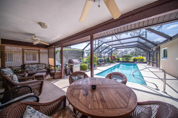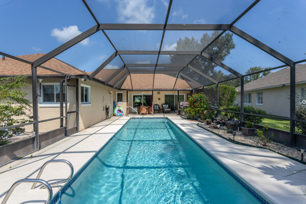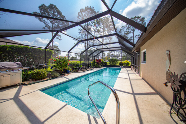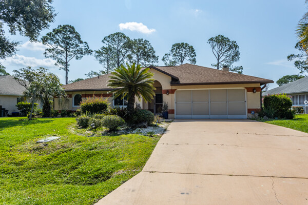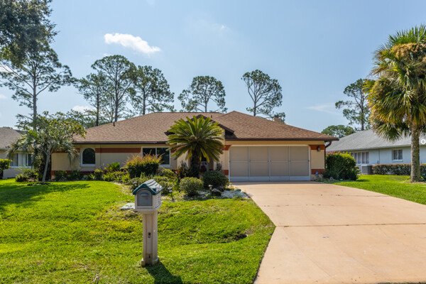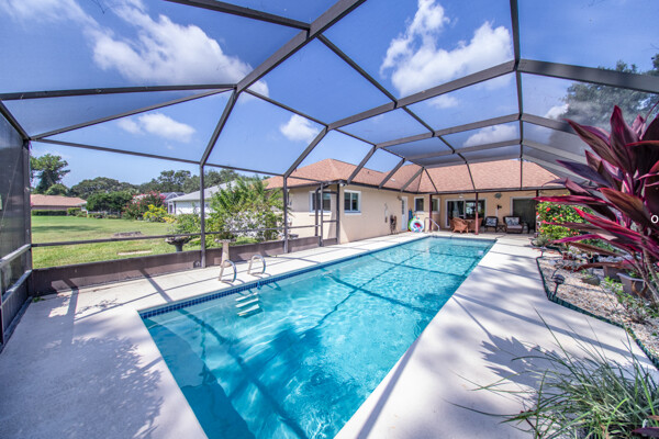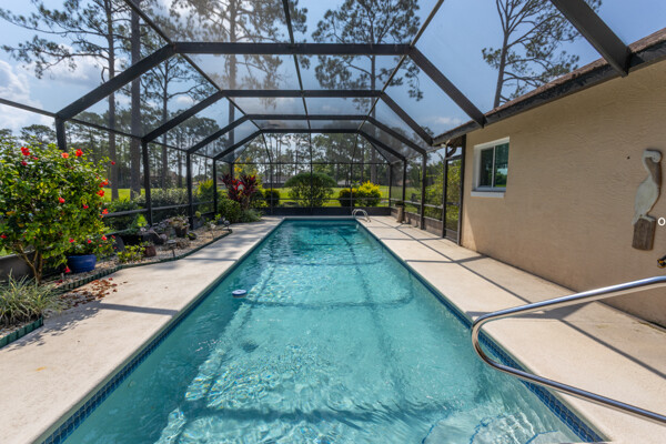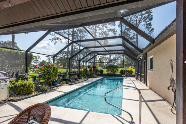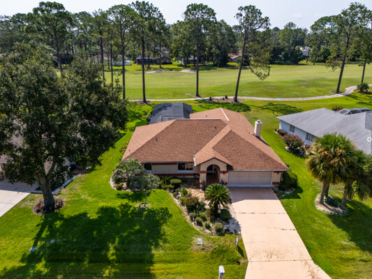 Under contract-accepting backup offers. Beautiful 4 bedroom, 3.5 bath POOL home located directly on the Pine Lakes Golf Course in the desirable W section of Palm Coast. This well-maintained home features real wood floors in the living areas, a cozy brick fireplace, and a spacious kitchen with upgraded cherry cabinets, JennAir cooktop & oven, stainless-steel appliances, including a wine fridge, and a butcher block movable island with plenty of storage. The split floor plan offers a private master suite with a large walk-in closet, an elegant vanity with double sinks, a whirlpool tub, a separate shower, and sliding doors out to the pool. One guest bedroom has its own en-suite bath, perfect for guests or in-laws. The home has updated windows and sliders, hurricane shutters, and a central vacuum system. AC has a built-in air scrubbing system. Step outside to enjoy a covered and screened lanai overlooking the resurfaced 40 x 9.5 lap pool and golf course views. Ideal for entertaining or relaxing Florida-style! This home can be sold completely furnished. Home has a very successful history as an Airbnb. Documents provided upon request.