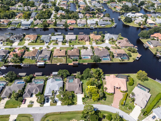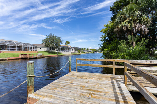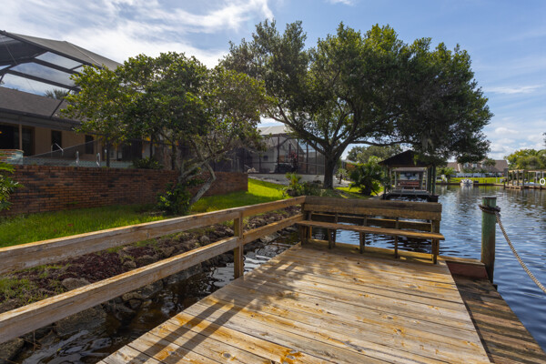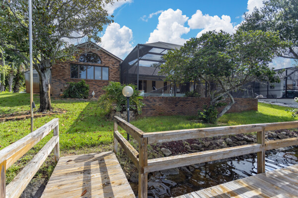 One or more photo(s) has been virtually staged. Experience the lifestyle of canal-front living in this nicely maintained pool home. Enjoy expansive water views, complete with a sparkling pool and a tranquil coquina rock waterfall. With 70 feet of frontage and a spacious 10' x 20' dock, it's the perfect place to relax and take in the serenity of the water views. Inside, a 17' x 18' family room overlooks the canal, featuring a wall of windows that flood the space with natural lightideal for entertaining or gathering with family. The living and dining rooms add comfort and versatility, while the primary suite offers an en suite bath designed to be handicap accessible. Recent updates include a widened driveway (16' across for extra parking, 2021), new HVAC (2023), roof (2017), and updated dock wood (2012). With inviting stone accents, this home offers excellent curb appeal and a welcoming presence. Schedule your private tour today!