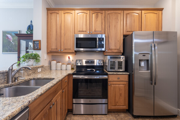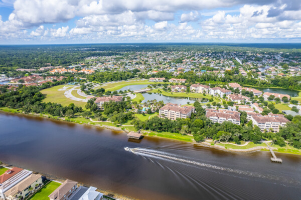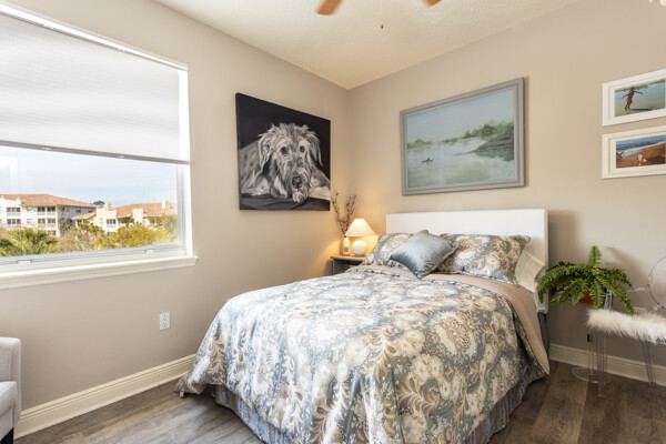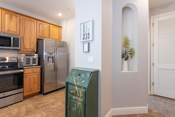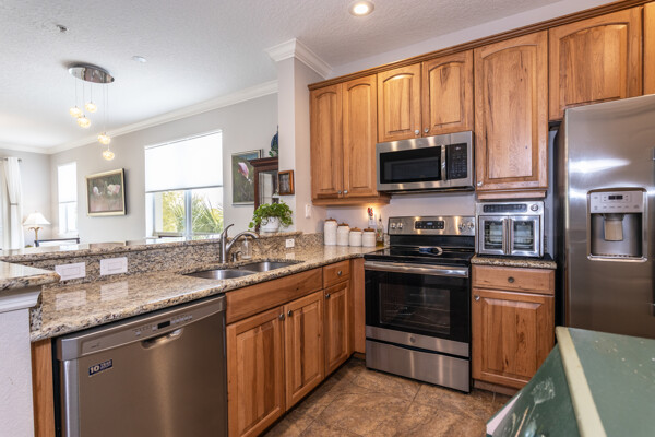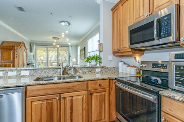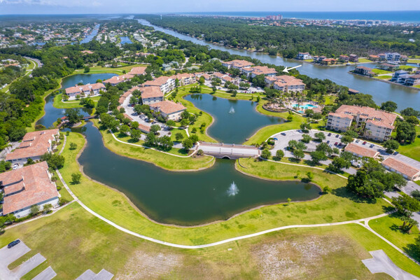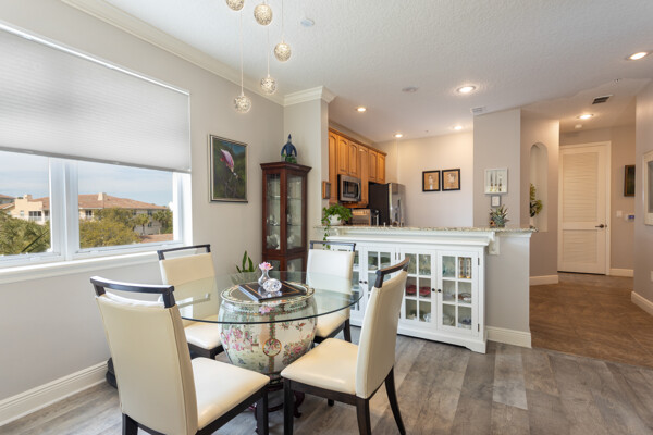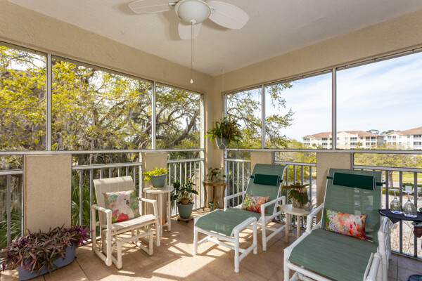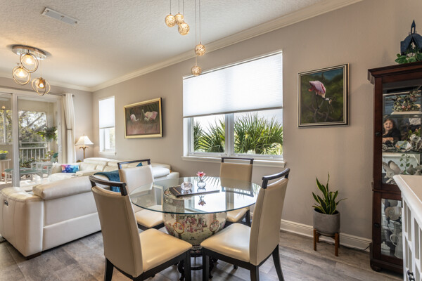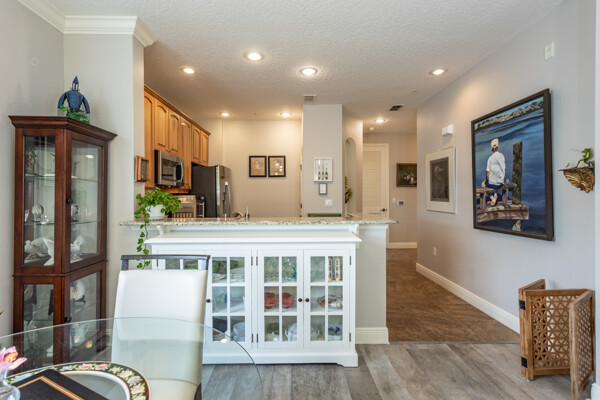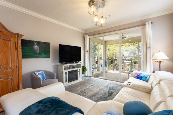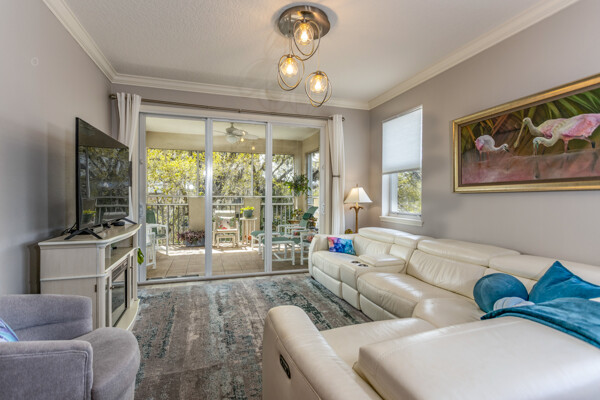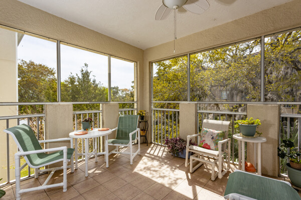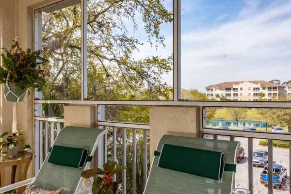 This condo conveys with a one car GARAGE. Step into this beautifully updated 2-bedroom, 2-bathroom condo, where lush oak and palm trees swaying in the breezes create a serene retreat. From the screened patio, enjoy glimpses of the Intracoastal Waterway, and an emerald lake with fountain, and all the surrounding trees make the patio feel like a private treehouse, complete with the soothing sounds of birdsong. Inside, LPV flooring, and NEW lighting and fans, add warmth and sophistication. The kitchen is equipped with stainless-steel appliances (2019), new cabinet hardware (2025), a brand NEW full-size washer and dryer, elegant dining light and modern window treatments. AC is NEW and water heater (2018). Sunlight fills this condo because of all the windows, creating an inviting and airy atmosphere, while the one-car garage provides both convenience and security. For a monthly HOA fee of $775, enjoy resort-style living, cable, high-speed internet, and access to scenic walking paths along the Intracoastal Waterway. There is NO CDD fee or additional amenities fee! This pet friendly community offers fun activities, and pickleball enthusiasts will love joining the dedicated team. This wonderful condo offers the perfect space to relax, unwind and enjoy Florida at its best.
